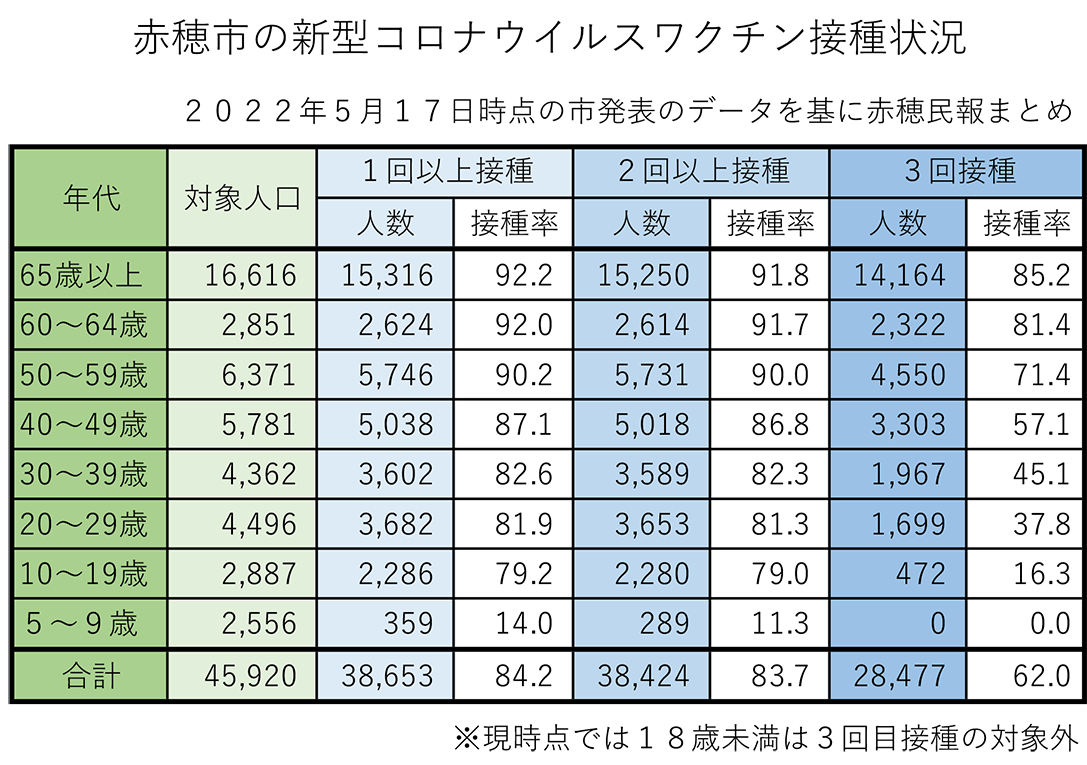 赤穂市からワクチン接種状況に関するデータが新たに公表されましたので、記事と表を更新しました。(2022年5月25日15時15分)