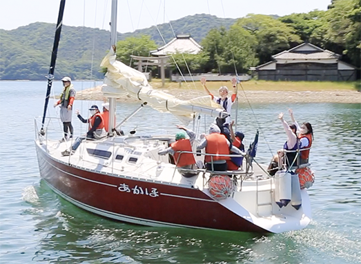 坂越湾で行われたヨット体験乗船会。奥に見えるのは生島の御旅所