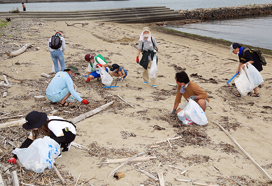 参加者らは回収袋を手に唐船山から東に向かって砂浜に沿って歩きながら空き缶やペットボトルなどを回収。約1時間半かけて約600メートルの区間を清掃した。複数回参加しているという加里屋中洲の女性(50)は「少しでも自分にできることをしようと思って拾っています」と話し、小さなごみも手でつまんで集めていた。