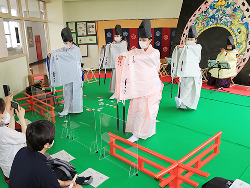 この日は特別に学校の許可を得て、これまで演奏を見てもらう機会がなかった保護者を招待した。普段活動している校舎4階の稽古場で、京都から取り寄せた色とりどりの直垂を着用した部員たちが舞と龍笛演奏を披露した。