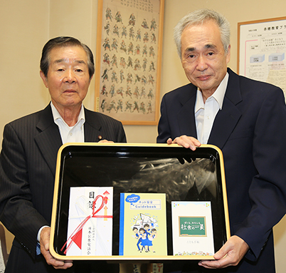 子どもたちの安全教育に役立つ教材冊子を赤穂市教委に寄贈した日本公衆電話会兵庫支部の重松英二顧問
