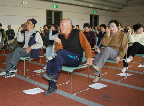 市民総合体育館ジムのトレーナー、鍛冶本克子さんの指導で、いすに座ったままできる体操を実践。軽快な音楽に合わせて、足踏みや手足の開閉などリズミカルに運動した。