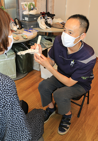 靴や中敷きを加工するための機器や工具を積んだ移動工房車で出張。カウンセリングで足のトラブルの状態や原因を丁寧に説明し、利用者にとって最適な靴や中敷きを提案する。