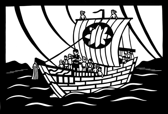 そのうち、きんこんさんは大きな船を新しくつくり、新しい帆を買い入れました。たまたま、岡山の城下で大きな催しごとがあり、きんこんさんは村の子どもを十人余りも船に乗せて、それを見に行くことになりました。子どもの親たちは反対しましたが、夜中にこっそり子どもたちを乗せて出発してしまいました。