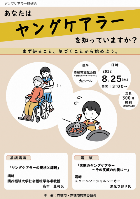 家事や家族の世話、介護などに追われる子どもの実態や現状を知る研修会「あなたはヤングケアラーを知っていますか? まず知ること、気づくことから始めよう。」が8月25日(木)、中広の赤穂化成ハーモニーホールで開かれる。
