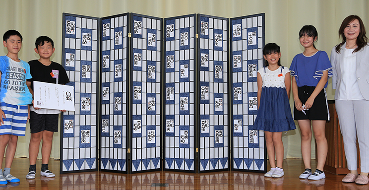 ますもとにこさん=右端=から城西小学校に寄贈された赤穂義士の笑い文字衝立
