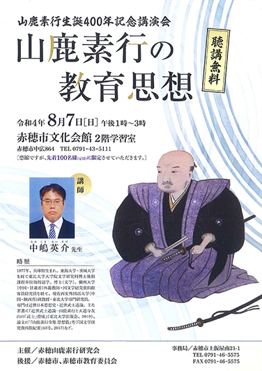 赤穂藩とも関わりの深かった江戸時代前期を代表する思想家を顕彰する講演会「山鹿素行の教育思想」が8月7日(日)、中広の赤穂化成ハーモニーホールで開かれる。