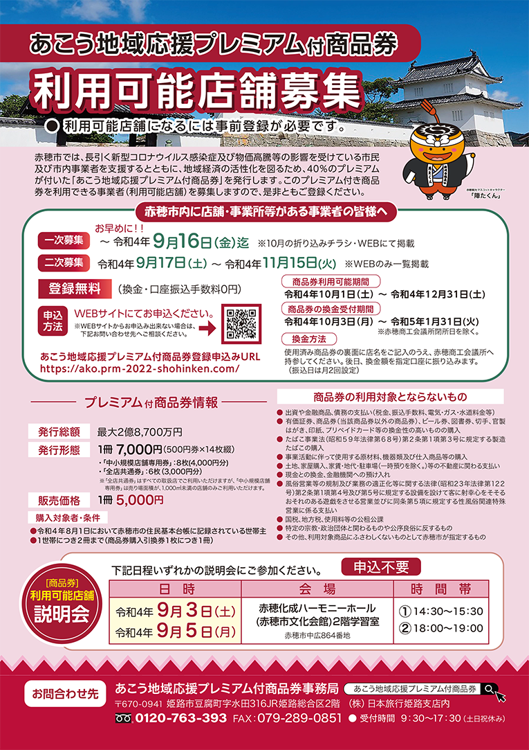 利用可能店舗の登録は無料。専用サイト(https://ako.prm-2022-shohinken.com/)で11月15日(火)まで受け付け、9月16日(金)までに登録すれば、10月に発行する折り込みちらしに店舗名が掲載される。