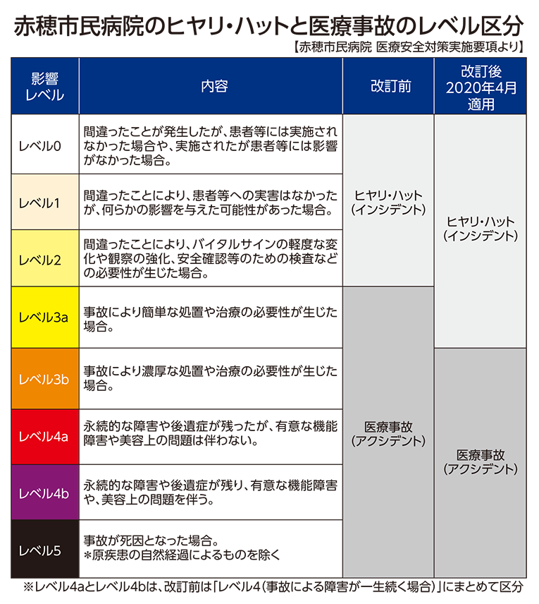 同病院が開示した資料によれば、要項改訂で医療事故とする基準を1段階引き上げて「レベル3b以上」に変更。改訂前は「医療事故」とされていた「レベル3a(事故により簡単な処置や治療の必要性が生じた場合)」は「ヒヤリ・ハット(インシデント)」に区分けられることになった。新基準は2か月後の4月から適用したという。