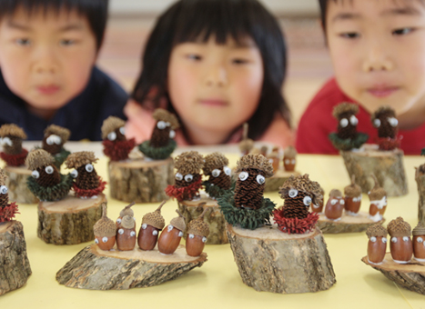 マテバジイの実は6つ並べて「笠地蔵」に。ボンドでオメメをくっつけて完成させた。梅山あやなちゃん(6)は「かわいいお顔になったよ」と出来上がった作品を眺めていた。
