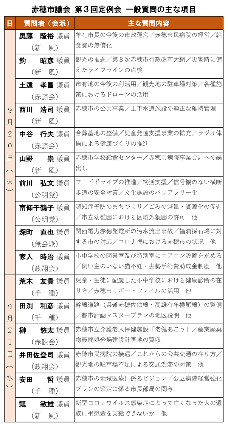 赤穂市議会は開会中の第3回定例会で9月20日(火)と21日(水)に一般質問を行う。