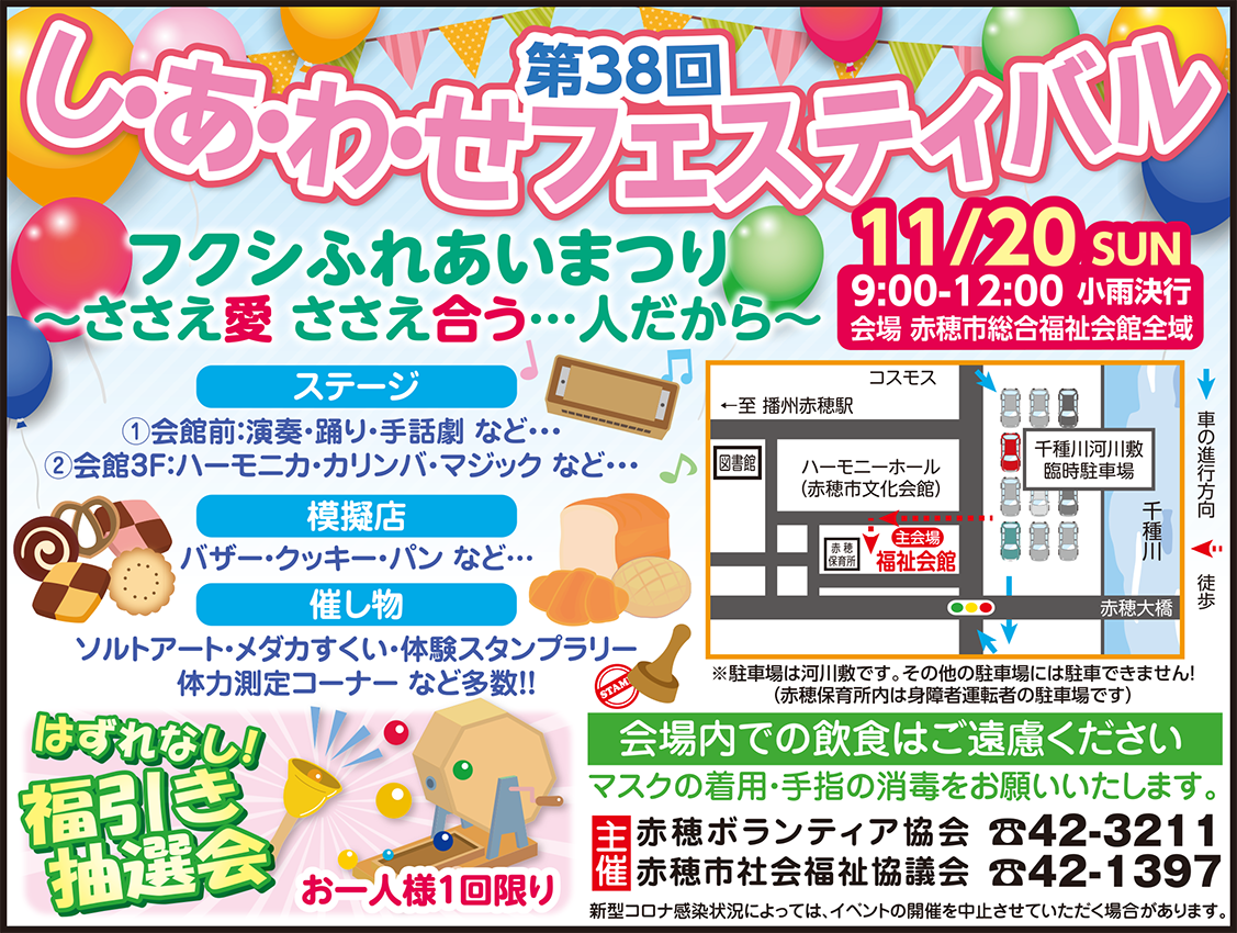 今年で38回目を迎える「し・あ・わ・せフェスティバル〜フクシふれあいまつり」(赤穂ボランティア協会など主催)は11月20日(日)午前9時〜正午、中広の赤穂市総合福祉会館で開かれる。小雨決行。