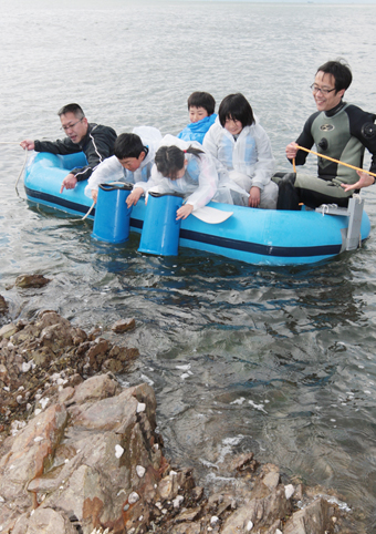 3〜4人ずつゴムボートに乗り、箱めがねで水中観察。数日前の雨によるにごりで期待したアマモの姿は確認できなかったが、「この下にアマモが根付いているんだよ」との三島さんの説明にうなずいた。