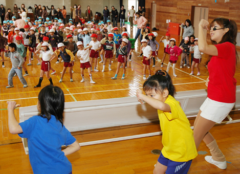 番組パーソナリティの木村三恵さんと国体キャラクター「はばタン」らで構成するキャラバン隊が来穂するのは初めて。高雄小体育館に集まった参加者らはキャラバン隊の動きに合わせ、頭を抱えて小さくしゃがんで身を守るポーズなど楽しく体を動かした。