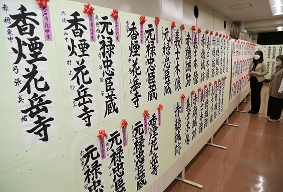 赤穂市内小・中学生から作品を募集した第51回赤穂義士祭奉賛学童書道展が30日、加里屋中洲の赤穂市民会館で始まった。