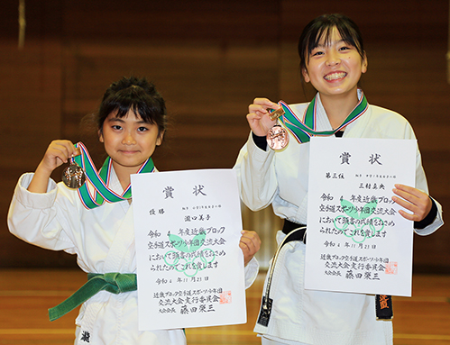 空手道の近畿ブロックスポーツ少年団交流大会で優勝した瀧口美子さん(左)と3位の三村真央さん