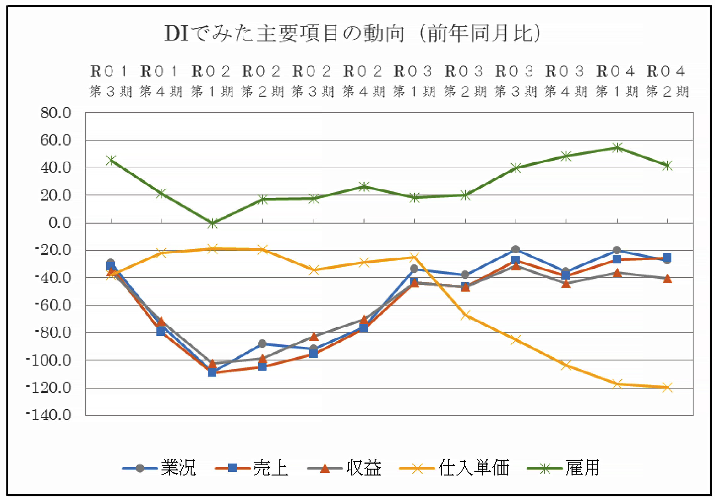 数値が大きいほど人手不足感を表す雇用DIも5期ぶりに下落し、経営を苦しめている仕入価格高騰と人不足の一服感が伺える。