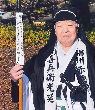 2012年から観光ボランティアとして活動する宮本さんは、その翌年の第110回赤穂義士祭に観光ガイド協会の推薦で義士行列に出演。役柄を理解しようと読んだ『義士銘々伝』で喜兵衛が槍印として短冊を付けて討ち入った逸話を知った。書道が上手な孫に頼んで短冊を用意。主催者の了解を得て槍に結んだ。観客からは気付かれなかったが、喜兵衛を偲びつつ行列を歩いたという。