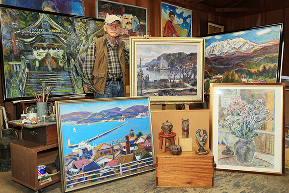 ▼「生活に美術を」テーマに個展=赤穂美術協会顧問の鳥井廣夫さん(86)=坂越=が市立図書館で個展。60年以上にわたる創作で生み出した絵画や陶芸など約80点を展示した。
