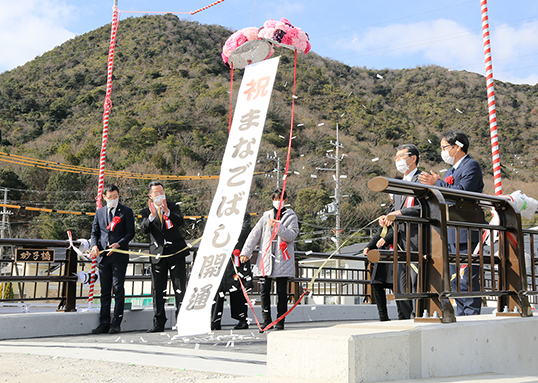 ▼砂子橋が開通=加里屋川の河川改修に伴い架け替え整備された「砂子橋」の開通式があり、地域住民ら約200人が渡り初めで祝った。