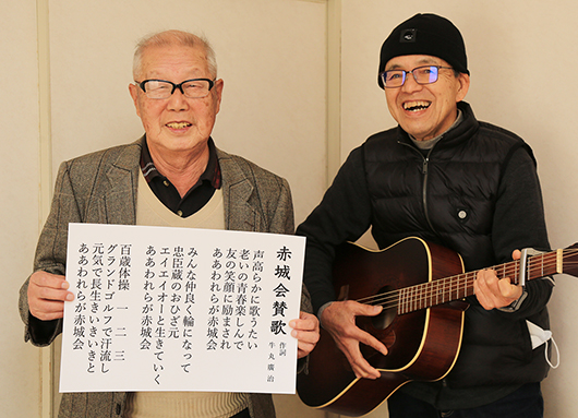 ▼老人クラブの愛唱歌、会員が作詞=上仮屋老人クラブ「赤城会」(榊敏会長)の愛唱歌を会員の牛丸廣治さん(85)=上仮屋南=が作詞。「鉄道唱歌」のメロディーで歌う。