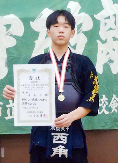 西角君は相手に1本も取られずにトーナメント4試合を完勝。決勝も得意のメンを打ち込み、同大会では小2のとき以来、自身6年ぶり2度目となる個人戦優勝を飾った。目標に掲げる「全国中学総体優勝」へ向け、「実戦の中で自分の力を知って、足りないところを練習して磨いていきたい」と精進を誓った。