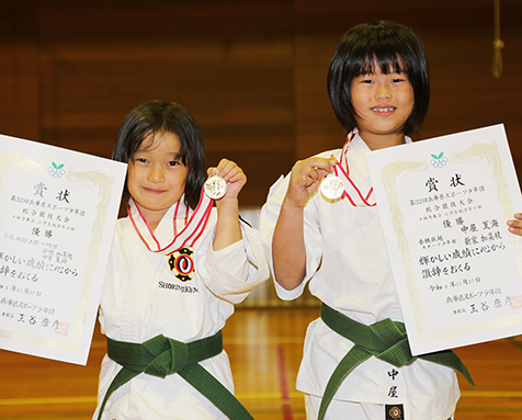 中屋さん・新家さん組は幼稚園からの仲良し。3歳で入門した中屋さんに誘われ、新家さんも5歳から始めた。県大会出場は今回が初めてで、「突きが良かった。最後まで頑張った」(中屋さん)、「残心がピッとできた」(新家さん)。「もっと上手になって、また金メダルをもらいたい」と口を揃えた。