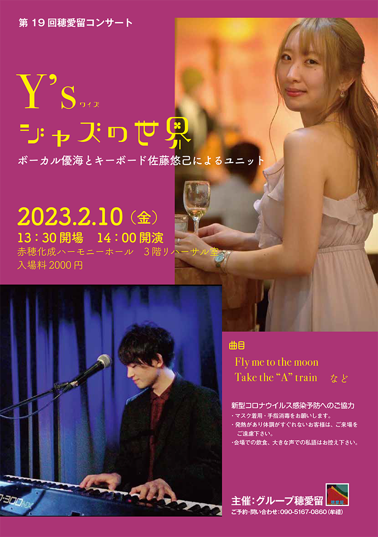 新規定住者の会「グループ穂愛留」の第19回コンサート。大阪を中心に活動するボーカル優海とキーボード佐藤悠己が『フライミートゥーザムーン』『A列車で行こう』などを奏でる。