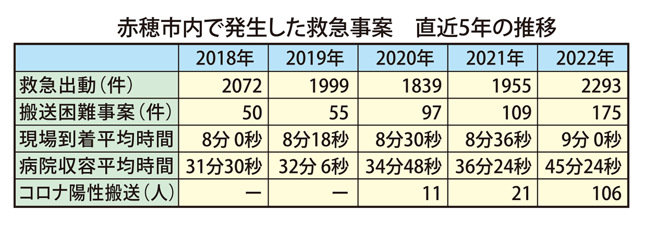 また、救急患者の収容先の内訳は、▽赤穂市民病院1106人(前年1076人)▽赤穂中央病院707人(609人)▽その他市内21人(20人)▽管外234人(151人)だった。