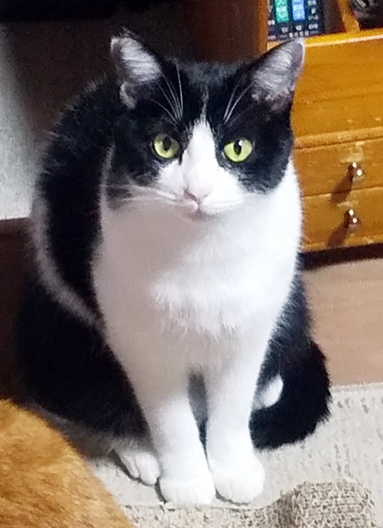 1歳半になる黒白のハチワレのオス。しっぽが黒くて長い。2月11日に細野町の自宅からいなくなった。右耳にV字型のカットあり。首輪はしていない。