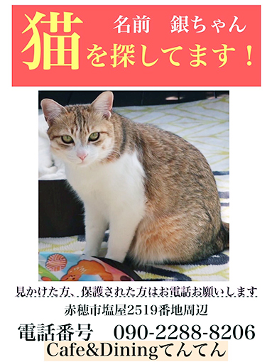 茶色のシマネコのオス4歳で胸と前足が白色でしっぽが短く、たぬき型。3月7日の昼頃に塩屋の自宅からいなくなった。名前は銀ちゃん。人なつっこい。去勢済み。首輪はしていない。