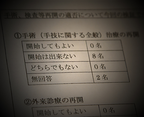 「自分で手術できているというが、実際は未熟な状態である」「手術というよりカテーテルをしたいと思っているようだ」「人間的にあり得ない程、問題が多すぎる」「病院として技術が未熟な事に関して、手術を止めているのは、法的に問題ないと考える。手術をさせた方が問題になる」などと男性医師に対する辛辣な批判が列記されている。その上で男性医師による手術を再開してもよいかどうか多数決をとり、「開始はできない」が多数となっている。