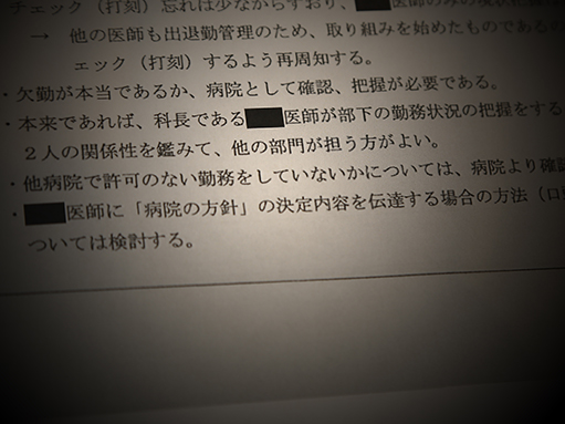 男性医師が手術の再開を強く希望していることに触れ、「再開の要件((1)周囲の医療スタッフと良好なコミュニケーションを図る(2)技術向上の修練を怠らない(3)4階の脳外科部屋に閉じこもらず、業務をおこなう)は守られていない」としている。また、「他病院で許可のない勤務をしていないかについては、病院より確認をおこなう」との記載があり、遅くともこの時には男性医師の副業疑惑を上層部が把握していたことを示している。