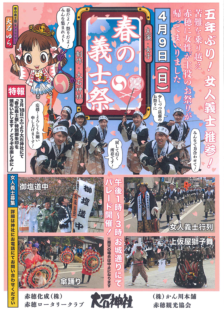 春の赤穂を彩る「大石神社 春の義士祭」は4月9日(日)に開催される。加里屋のお城通りを午後1時から3時まで歩行者天国とし、女性47人による「女人義士行列」、特産の塩を城へ献上する様子を再現した「御塩道中」などが練り歩く。