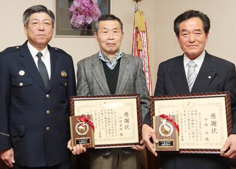 感謝状を贈呈されたのは、加里屋の畳店経営、山田富昭さん(67)と松原町の自転車店経営、中西尚さん(62)。