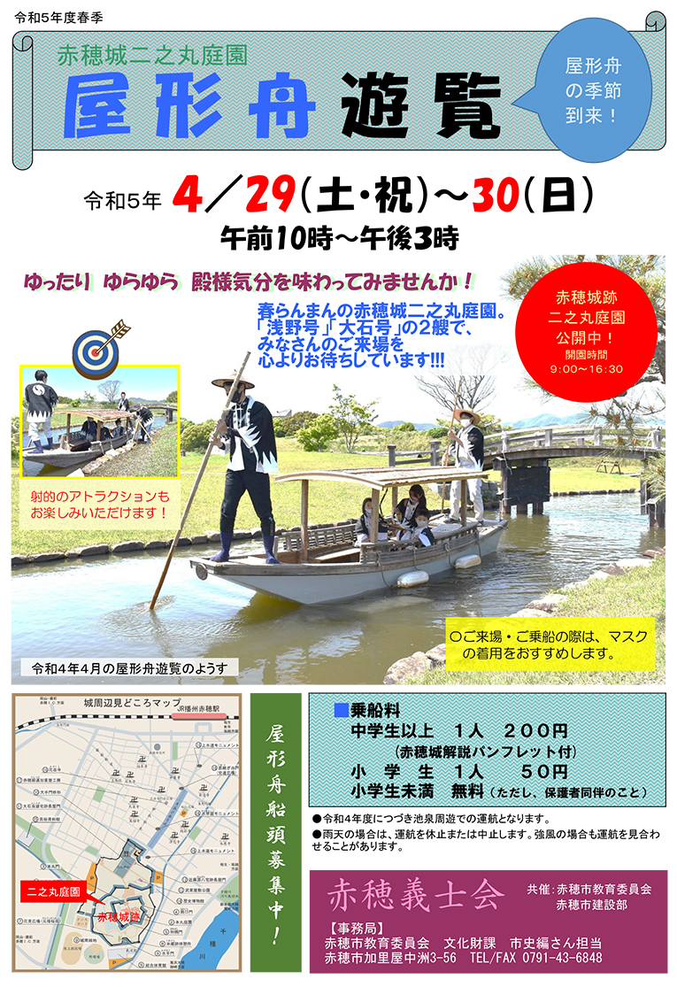 両日とも午前10時〜午後3時に運航(雨天や強風で休止の場合あり)。乗船料は1人200円(赤穂城解説パンフレット付き)、小学生50円、小学生未満無料(要保護者同伴)。問い合わせは同会事務局Tel43・6848(赤穂市教育委員会市史編さん担当)。