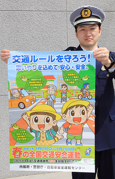 同運動は5月11日(木)〜20日(土)の10日間。▽こどもを始めとする歩行者の安全の確保▽横断歩行者事故等の防止と安全運転意識の向上▽自転車のヘルメット着用と交通ルール遵守の徹底ーを重点に全国一斉に運動を展開する。同署管内でも自転車街頭指導や通学児童の見守り活動などが行われ、交通事故防止を図る。