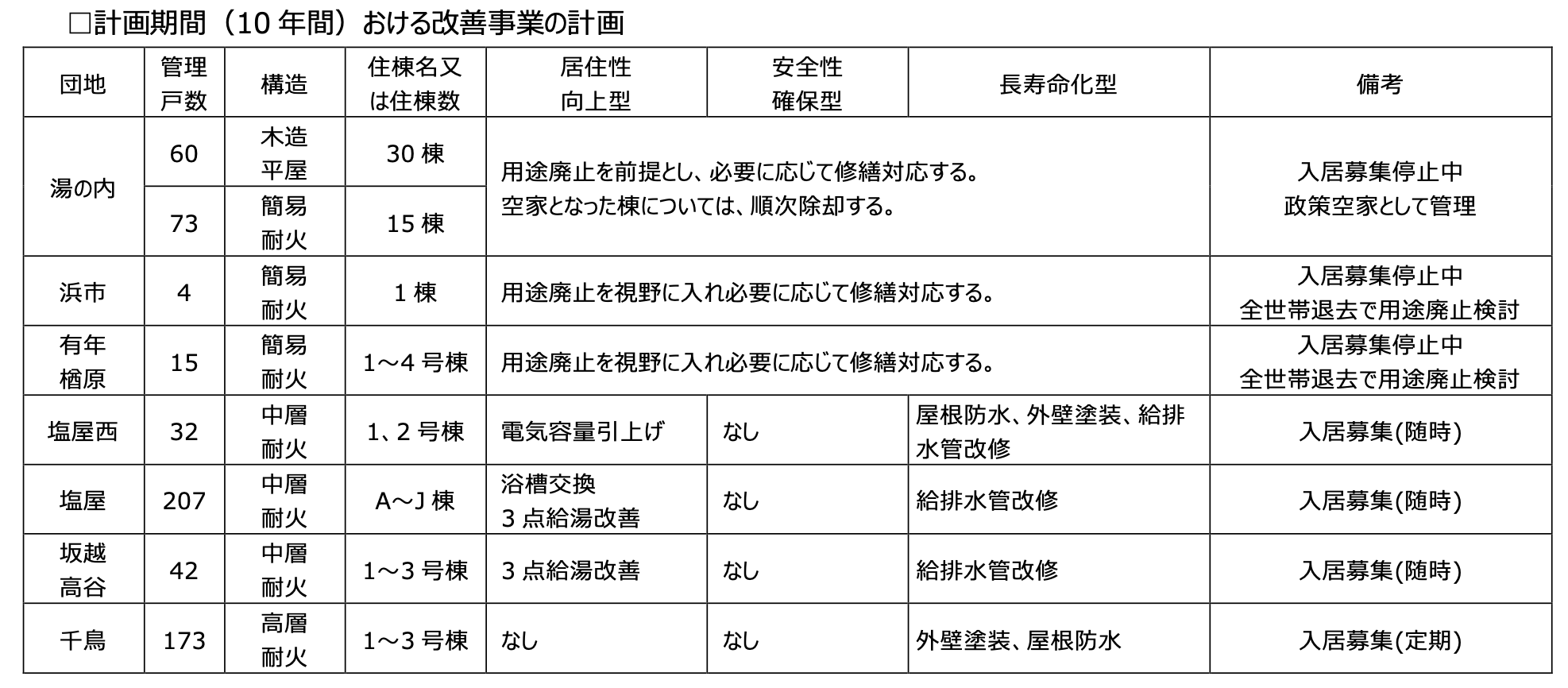 引き続き活用を図る4団地については電気容量の引き上げや屋根の防水、外壁の塗り替えなどを行う一方、湯の内は用途廃止を前提とし、空き家になった棟を順次除却。浜市と有年楢原は用途廃止を視野に入れる。
