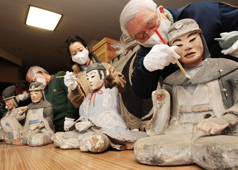 木像は昨年6月、中広の永応寺(楠哲雄住職)が市に寄贈した赤穂浅野家3代藩主と四十七士の50躰。「文化財への関心を高めてもらう機会になれば」と市教委が修復作業を手伝うボランティアを募集し、市内外から11人が申し込んだ。