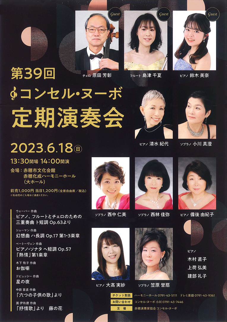 赤穂演奏家協会「コンセル・ヌーボ」(小川真澄代表)の第39回定期演奏会が6月18日(日)、中広の赤穂化成ハーモニーホールで開かれる。