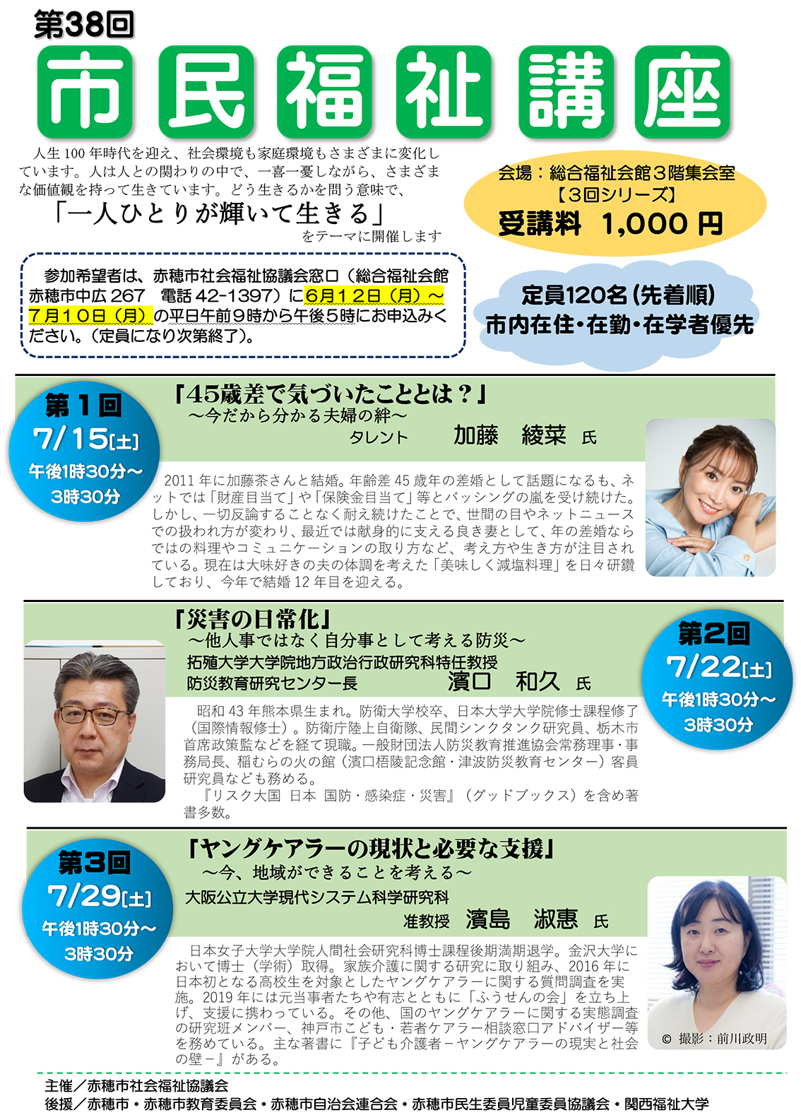 赤穂市社会福祉協議会は7月15日(土)から3回シリーズで開く第38回市民福祉講座の受講者を募集する。初回の講師に「ザ・ドリフターズ」加藤茶さんの妻でタレントの加藤綾菜さんを招く。