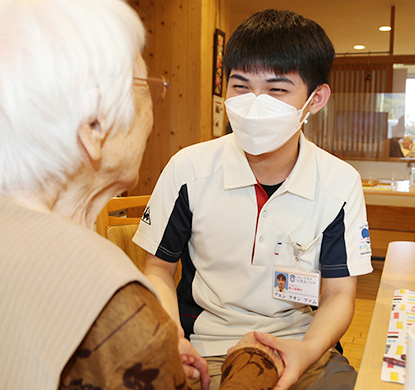 「利用者のみなさんが楽しくなってくれたら、僕もめっちゃうれしい」とやりがいを話すファムさん。「僕は一人っ子なので、いつかは両親の元へ帰ると思いますけど、できるだけ日本で長く介護の仕事をしたいです」と希望している。