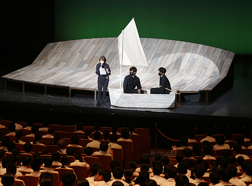 100年前に海賊が隠した宝を探そうとする登場人物たちによる物語。海賊船に見立ててステージ上に組まれた楕円形の舞台装置は演出効果によって登場人物の家や劇中劇のステージに変化し、生徒たちはスピーディーな場面転換の中繰り広げられる歌ありダンスありの躍動感あふれる音楽劇に見入った。
