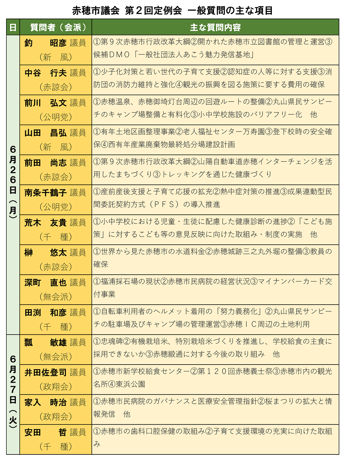 赤穂市議会は6月26日(月)と27日(火)の第2回定例会本会議で一般質問を行う。