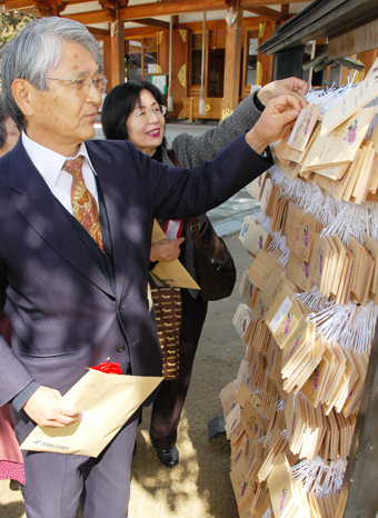 作品の絵馬を奉納する大賞受賞者の宮崎維二さん