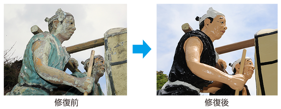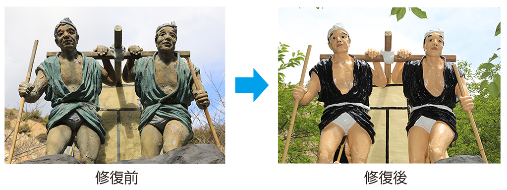 市内自営業者らでつくる社会奉仕団体「啓昌会」(深口奥広会長)がメンバーを中心に修復プロジェクトを立ち上げ、今年1月からクラウドファンディングも活用して募金活動。企業、団体、個人から98口計200万円近い寄付が集まった。像を支える鉄骨やモニュメントの亀裂を修繕し、人形を再塗装。モニュメントを囲む安全柵を新調した。
