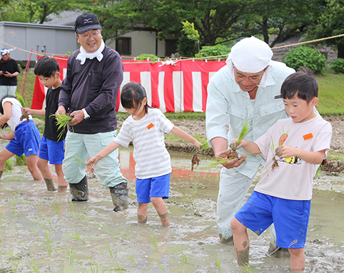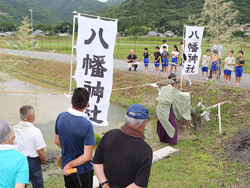 東有年八幡神社(宮下憲章宮司)のお田植え祭が東有年沖田遺跡公園横の神田で21日にあり、地域の子どもたち約20人が参加した。