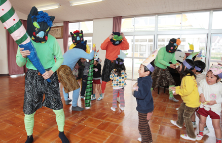 「自分の心の中の鬼を追い出そう」と実施。「いたずらする子はいないかー」「弱虫な子はいないかー」とうなりながら教室に乱入してきた赤鬼や青鬼に向かって、園児らが手に握りしめた豆を力いっぱい投げつけた。