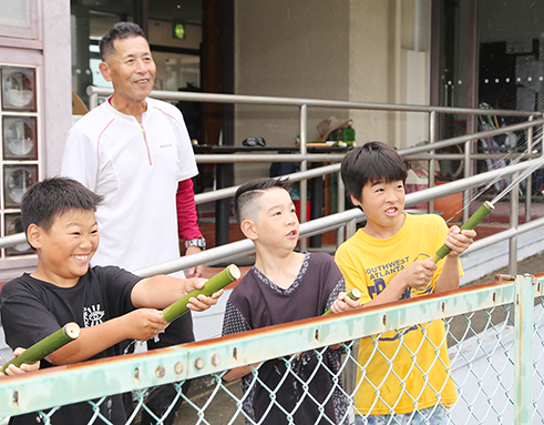 竹筒でできた水鉄砲で遊んだ「こども食堂ぱずる」の参加者
