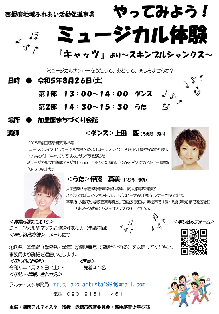 参加無料。ミュージカルやダンスに興味がある人を対象に年齢を問わず先着40人を募集する。TEL090・9161・1461。